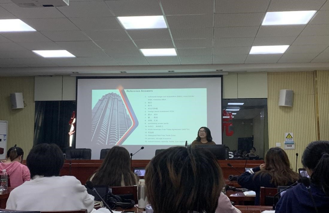 姚老师的公开课以《口译教程》第六单元为授课内容,授课对象为英语2001、2002班的学生。本次公开课主要讲授数字口译(figure interpreting)。课程热身环节,姚老师通过现场问答+分享自身口译经历的方式引入数字口译话题,引起学生对数字口译的兴趣;随后她带领学生从口译特点、数字信息密集、汉英计数差异等方面分析了数字口译的难点,以及如何运用即时转换及二次转换法处理数字;最后,姚老师准备了数字口译及含有数字信息的口译两类练习,帮助学生熟练掌握数字双语转换的同时,也锻炼了学生的口译实战能力,实现了教学与实践的结合。课后,听课教师针对公开课情况进行了一次集体研讨。老师们充分肯定了姚老师的教学水平和素养,同时针对如何优化教学方法、丰富教学手段和提升教学效果提出了非常好的建议和意见。