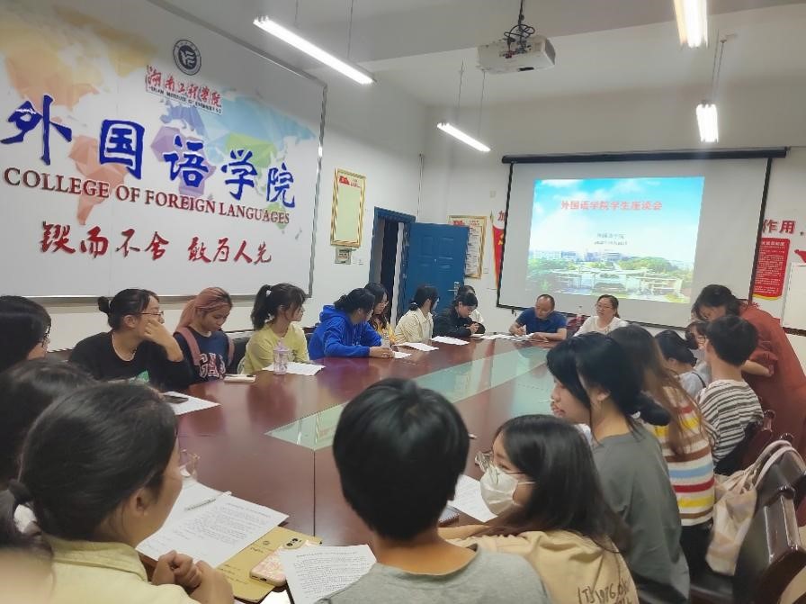 在F119召开了学生座谈会。座谈会参会学生为2020级、2021级和2022级英语和商务英语两个专业的学生干部及学生代表。教学副院长彭禹、副书记罗望阳和学生辅导员参加了此次座谈会。