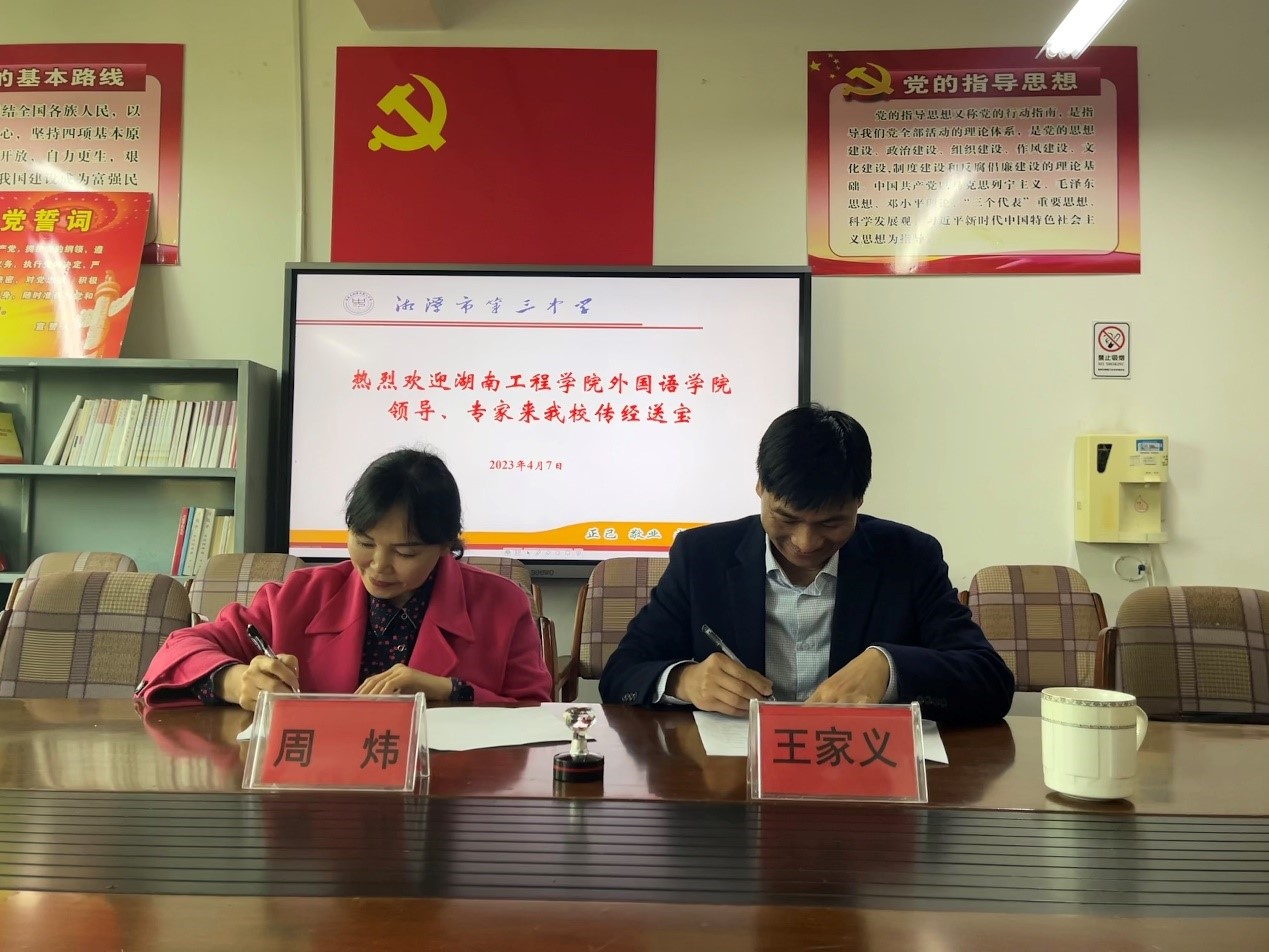 院长王家义、英语系苏静、刘欣一行来到湘潭市第三中学就两校建立英语教学实习基地事宜进行交流洽谈。湘潭市第三中学校长周炜、副校长陈自力等教师代表出席了交流会。