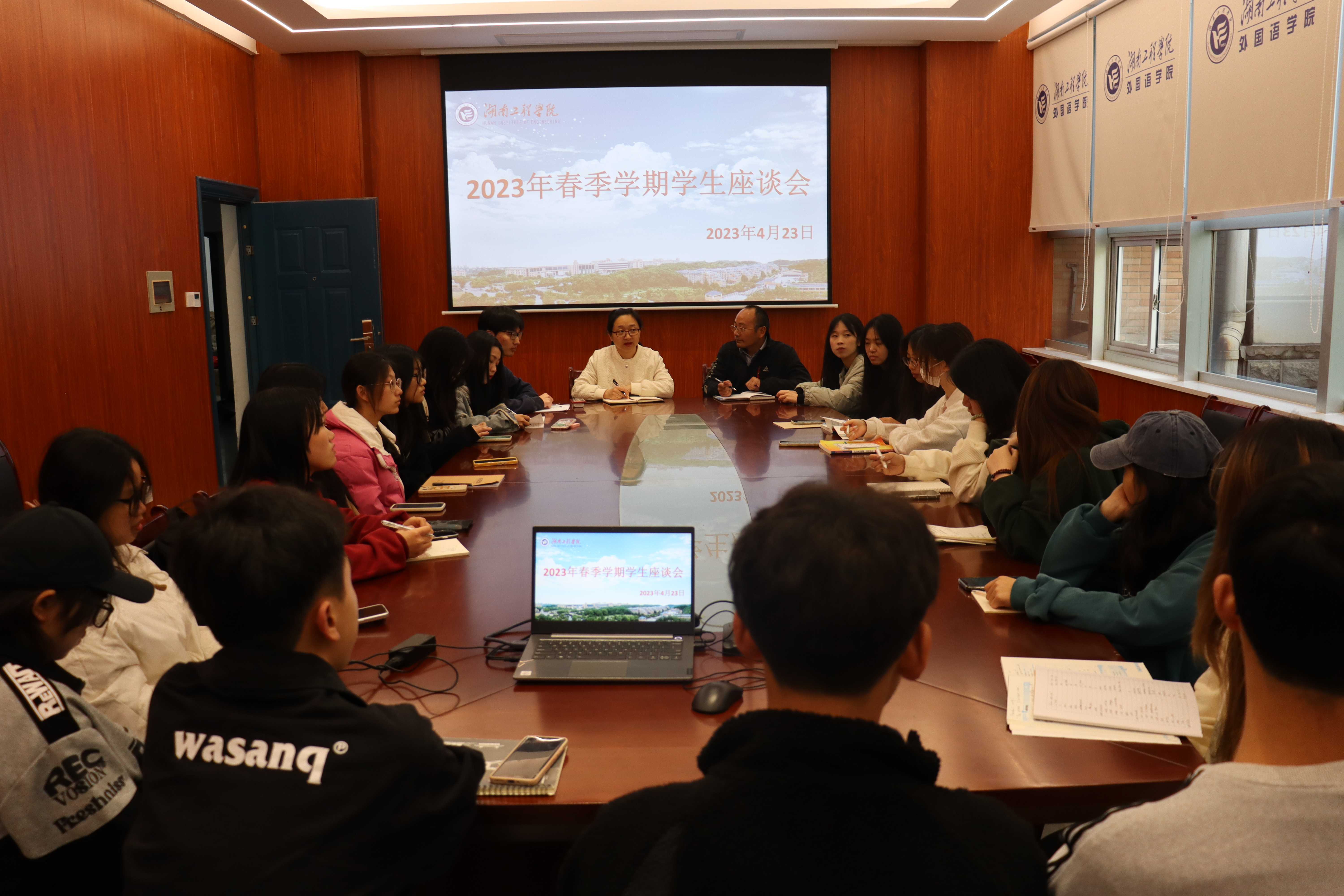 在F119召开了学生座谈会。座谈会参会学生为2020级、2021级和2022级英语和商务英语两个专业的学生干部及学生代表。教学副院长彭禹、副书记罗望阳和学生辅导员参加了此次座谈会。