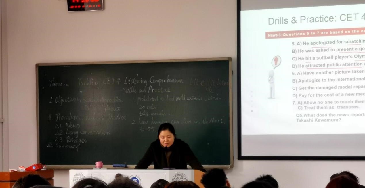 12月精彩一课,针对即将来临的大学英语四级考试,授课内容为大学英语四级考试听力考试技巧。大学英语一教研室的老师和大学英语二教研室的毛宁等老师出席并观摩了此次公开课。