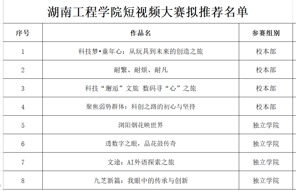 “用英语讲好湖南故事”短视频大赛暨省赛选拔赛的通知》精神,经学生团队申报,校内外专家评审推荐,拟定“科技梦•童年心:从玩具到未来的创造之旅”等4个作品获一等奖,“浏阳烟花映世界”等7个作品获二等奖。根据省级复赛推荐指标要求及团队申报意愿,拟推荐“科技梦•童年心:从玩具到未来的创造之旅”等4个作品代表校本部,“浏阳烟花映世界”等4个作品代表应用技术学院参加第二届湖南省大学生“用英语讲好湖南故事”短视频大赛。现将结果予以公示。