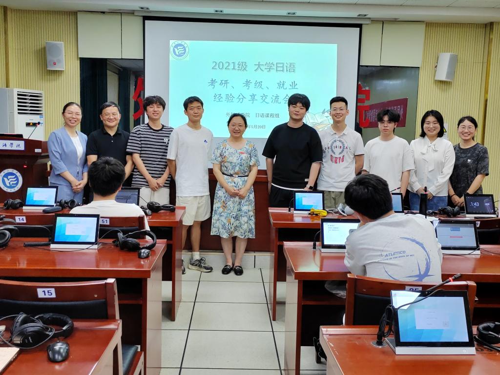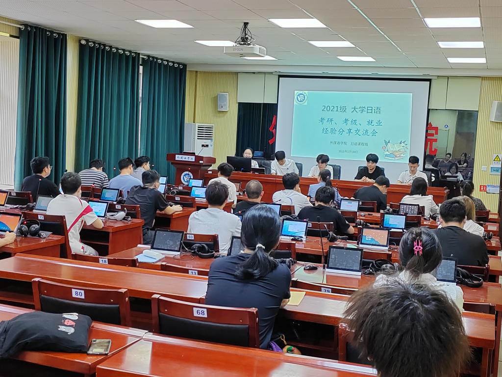 在F309会议室举办了“大学日语考级•考研•就业经验分享交流会”。会议由陈红老师主持,教学副院长彭禹、全体日语教师、21级优秀毕业生代表及各年级学生代表参加了本次活动。