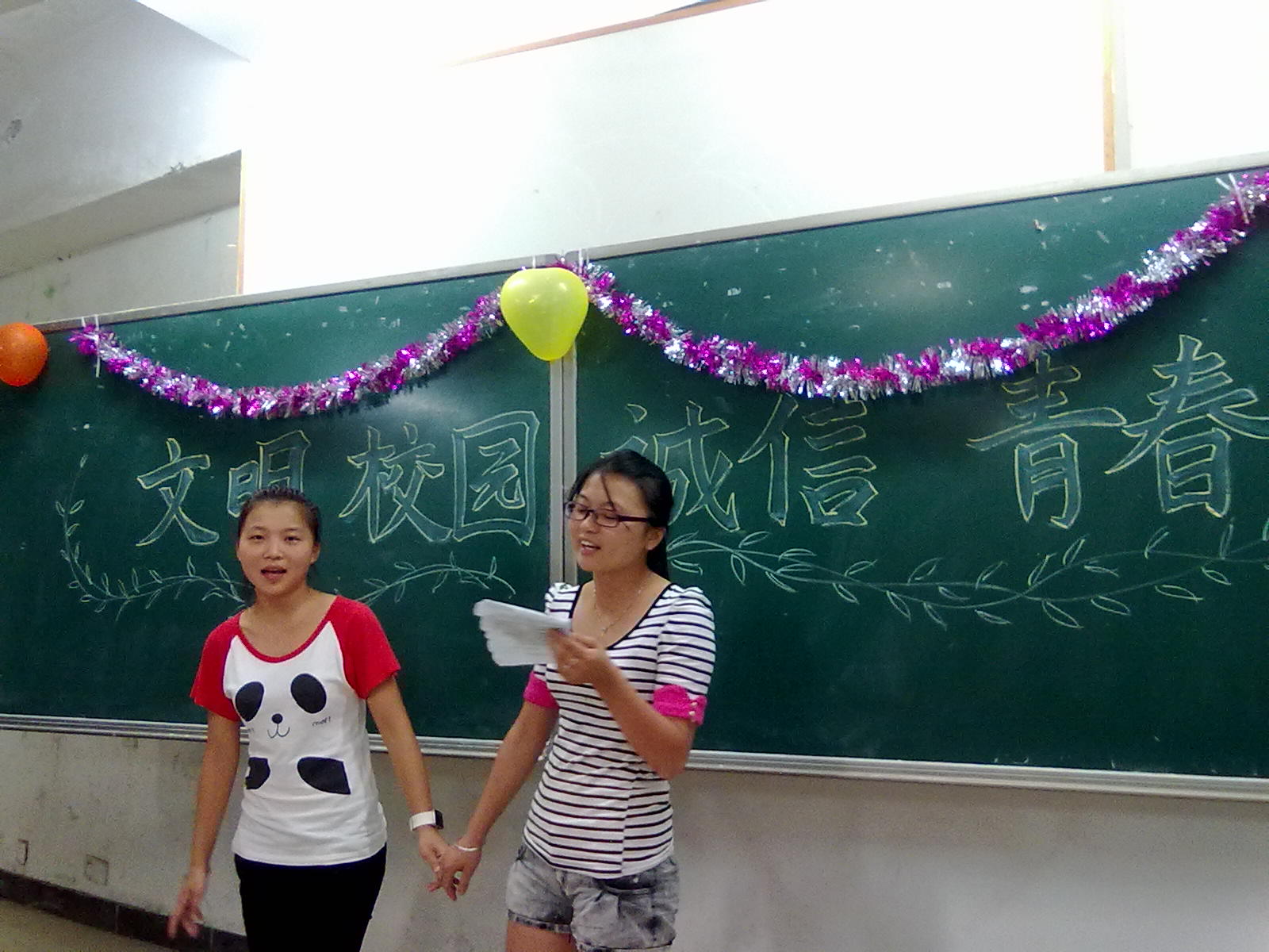 教室经过精心布置,有彩带、有心形气球和五角星贴纸。活动也以多种形式展开,有动听的歌曲、优美的舞蹈、感人的生活小故事、笑话、有趣的游戏等,都迎来同学们一阵阵热烈的掌声。