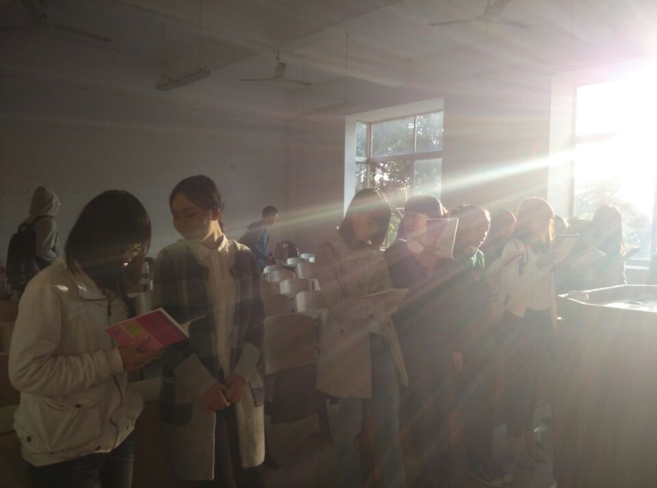 14级新生集合签到完毕后,由各班领读的教练带到本班指定位置,各班同学昂首挺胸,意气风发!室内室外书声琅琅不绝于耳,为静谧的早晨更添一份蓬勃朝气!首次晨读,各位兢兢业业的教练先自我介绍以及寄愿新生学子大胆开口,不怕犯错。以简单有趣的英文数字游戏开场,晨读气氛活跃,各位同学积极参与。随后20分钟由教练带领同学们大声朗读国际音标。直至7点40分晨读结束。