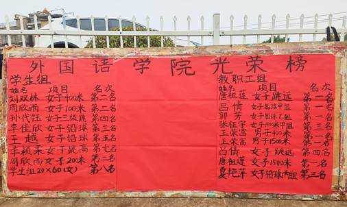 喜报频传,战果累累。教职工组唐祖莲老师获女子跳远第一名、女子1500米第一名,王荣富老师获男子400米第一名、男子1500米第一名,吕倩老师获女子铅球甲组第一名、女子跳远第四名,郭芳老师获女子铅球乙组第一名,张钲宇老师获女子1500米第三名,夏艳萍老师获女子铅球丙组第三名。学生组刘双林获女子400米第二名,周欣雨获女子100米第二名、女子200米第二名,孙代钰获女子三级跳第四名,李佳欣获女子铅球第三名,王越获女子铅球第五名,李颖柔获女子跳高第七名。在学生组20×60女子接力中,外院获得第八名。上述的显赫成绩可喜可贺,也希望外院的健儿们保持这份激情,昂扬斗志,接续接力,来年再战!