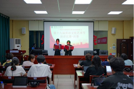 2025年5月13日晚19:30,第十九届英语文化艺术节演讲比赛决赛在主校区F309教室正式开始。本次演讲比赛的主题是:What is national is also international. 并采取“主题演讲+评委提问”的形式进行评分。此次决赛邀请到周冬华、谭芳、陈锋三位老师担任评委,他们凭借丰富的专业知识和经验,为比赛的公正性与专业性提供了坚实保障。