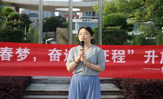 礼毕,商务英语1904班李振静开始了国旗下的讲话:“在新时代下,青年一方面应该跟从党的引领,将先进精神转化到实践中去。另一方面应脚踏实地、刻苦学习,把美丽的梦想变成光辉的现实。”