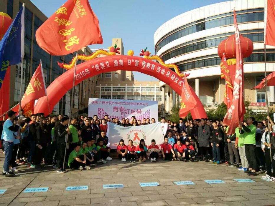 开场充满活力的健美操瞬间活跃了现场气氛。接着,主持人介绍本次活动的嘉宾有:湘潭市卫生计生委疾控科科长王涛、湘潭市疾控中心主任马金辉、湘潭市疾控中心副主任赵树海、岳塘区卫生计生局局长、岳塘区艾滋病防治委员会副主任龙丽艳、岳塘区卫生计生局副局长、岳塘区艾滋病防治委员会成员赵彩云和岳塘区疾控中心主任、岳塘区艾滋病防治委员会成员周长宝。紧接着,志愿者代表们为领导佩戴红丝带。然后,主持人邀请副校长杨剑瑜上台讲话。他表示,开展艾滋病宣传教育活动是很有必要的,它能引导同学们正确对待艾滋病,不至于谈“艾”色变,也不会过度轻视它。针对如何预防艾滋病这一问题,湘潭市疾控中心主任马金辉及岳塘区卫生计生局局长、岳塘区艾滋病防治委员会副主任龙丽艳跟学生强调到:“不论任何场合,我们都应保持强烈的预防艾滋病意识,不要存在侥幸心理,平时要洁身自爱;不与别人共用针头,使用已消毒注射器;小心使用血制品。但只要没有进入发病期,艾滋病病毒携带者仍能和正常人一样生活。”随后,领导授予志愿者们青春防艾旗,全体志愿者们进行宣誓。最后,领导带领所有志愿者们在敲门墙上签名,并合影留念。此次活动圆满结束。