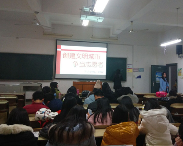 3月10日下午4点,英语1401与英语1402在A206举办了以“创办文明城市,争当志愿者”为主题的团日活动。