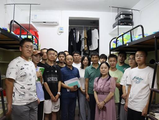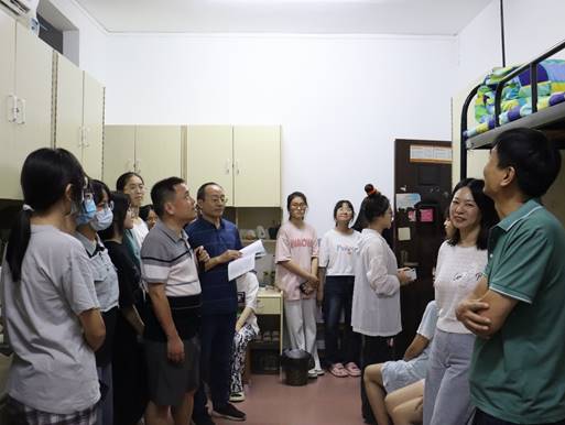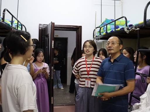 院长王家义、党总支书记陈亚琼、副院长吴斐、党总支副书记罗望阳、学办老师晏莉、张琼燕、彭虹以及各班班主任、朋辈辅导员,深入走访2022级外院本科新生宿舍,为新同学送去关怀与问候。