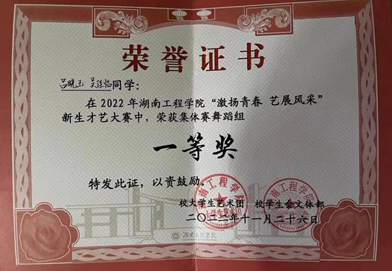 最终,吴佳临、黄子娟、吕晓玉、陶婷、张昕怡、戴乐瑶同学闯入决赛。在决赛的舞台中,吴佳临和吕晓玉夺得了团体赛舞蹈组冠军,吕晓玉获得个人赛舞蹈组三等奖,戴乐瑶和张昕怡获得了团体赛声乐组二等奖,黄子娟和陶婷获得了团体赛舞蹈组优胜奖,戴乐瑶在个人赛声乐组中获得优胜奖。