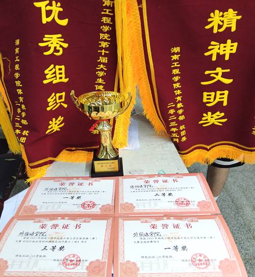 在此次大赛中喜获啦啦操花球项目一等奖、街舞项目一等奖、健美操项目二等奖、爵士项目三等奖、团体总分第三名、优秀组织奖、精神文明奖的优异成绩!