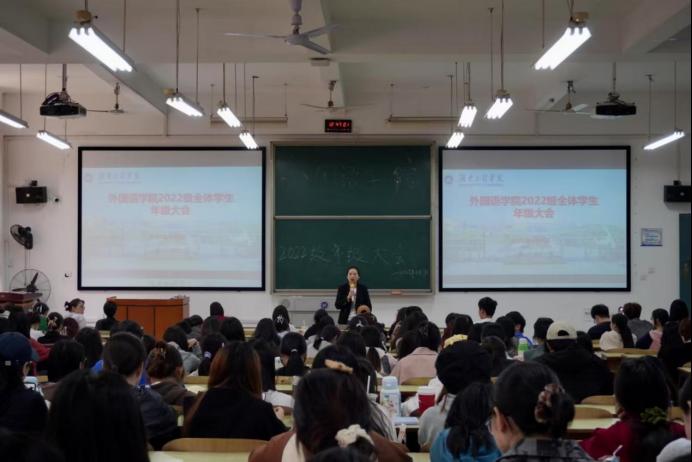 在D101报告厅隆重召开2022级全体学生年级大会。本次会议由学院党委副书记朱洁主持,学工办辅导员晏莉、张琼燕、彭虹三位老师主讲,2022级全体学生参加。