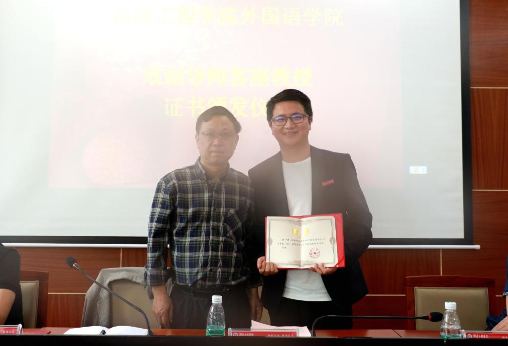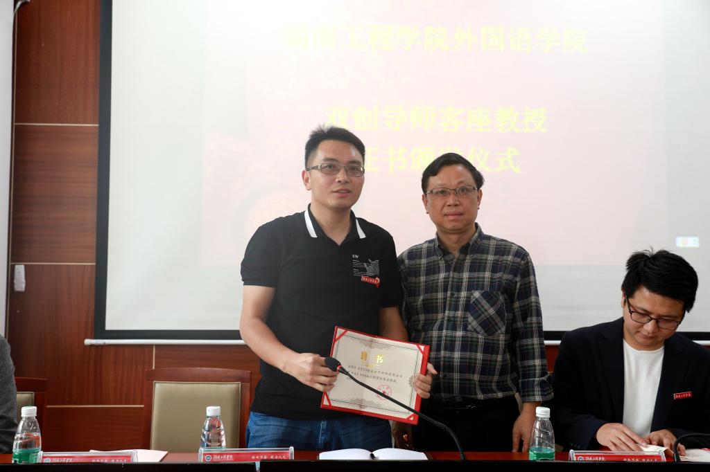 助学基金颁发后,娄炳林、杨永和分别为杨杰、邓凌波颁发了《创新创业导师》、《客座教授》聘书并为他们佩戴校徽。