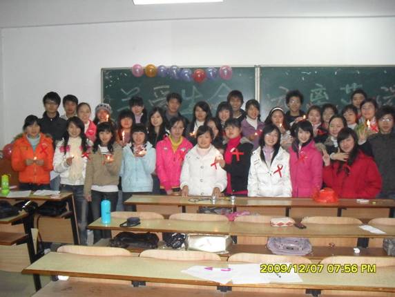 2008、2009级各班举行了一场以“珍爱生命,远离艾滋”为主题的团日活动,旨在提高同学们对艾滋病的认识并能有效地预防艾滋病的产生。