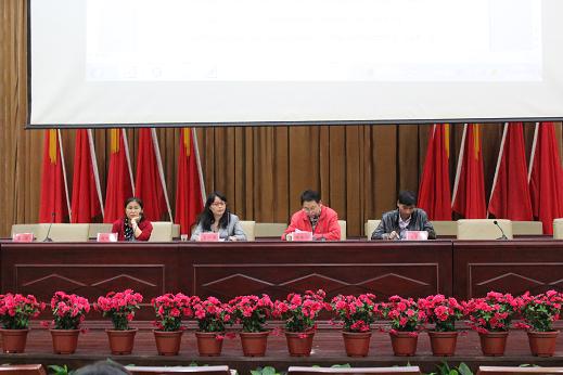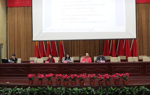 学习深造表示欢迎和祝贺,表达了对新生殷切的期望,提出“知者不惑,仁者不忧,勇者不惧”的忠言,同时,和新生分享了许多关于做人做事与学习的建议。接下来,肖江淑书记从学院的发展历史、师资力量、教学设备等方面对学院情况作了详细的讲解;副院长刘向红阐述了专业素养教育的含义,并提出本科教育的目的在于培养人才;副院长王家义对学籍管理制度作了详细的解释。会议最后,英语教研室章明蕾老师和商务英语教研室陈晓老师用专业又幽默的语言向学生们作了专业介绍。