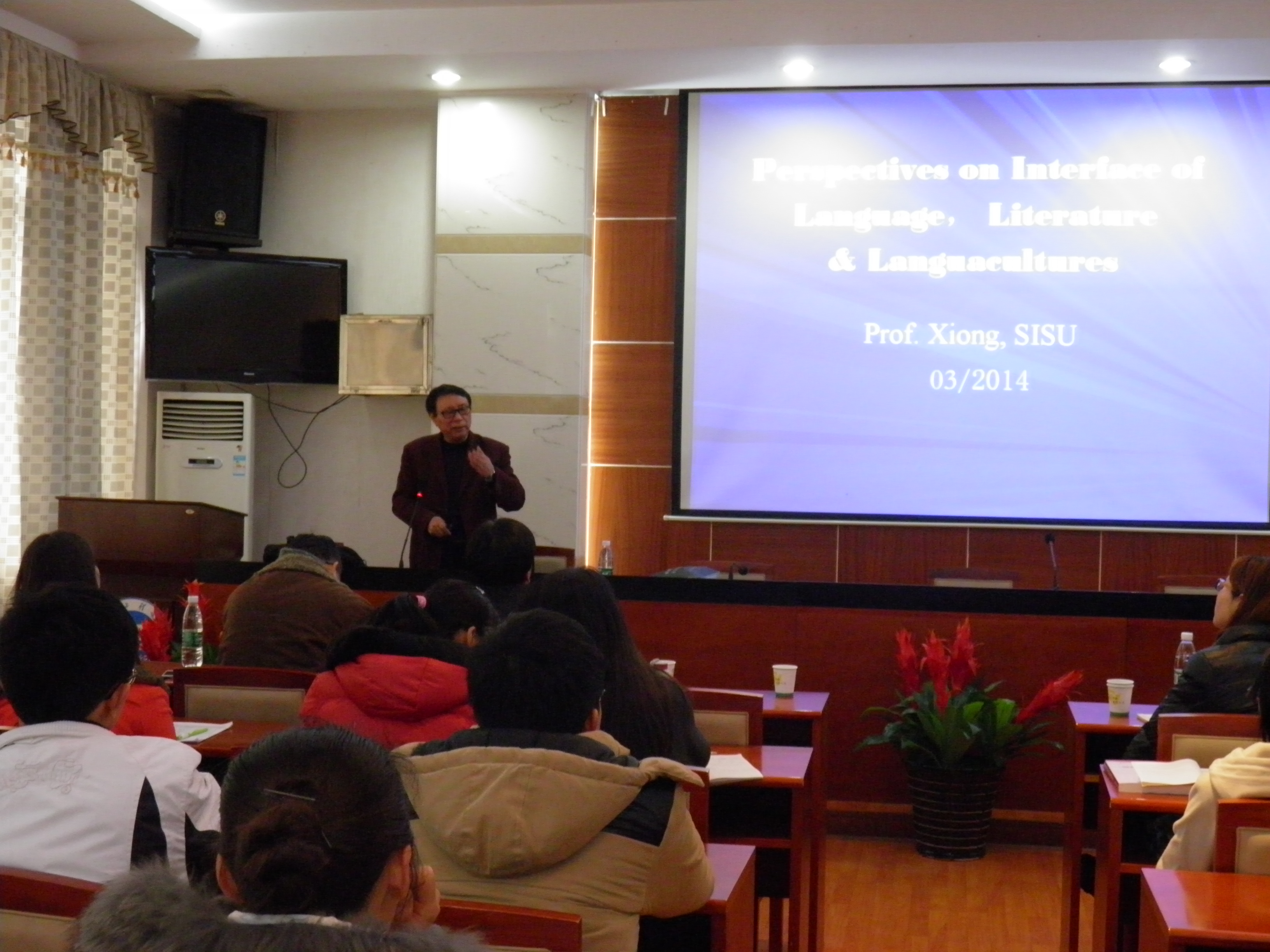 接着熊沐清教授给老师同学们带来第二顿学术大餐,他作了一场题目为“界面研究与科研创新——以认知诗学为例”的学术讲座。首先他为大家讲了选题必备的科研素质,鼓励大家敢为人先,敢于创新。接着通过事例带领大家了解认知诗学的解释力。最后告诉大家界面研究的目的及意义,提醒大家界面研究已经成为学科发展的一种内在动力,建议大家学会创新,催生新的学科。他还耐心的回答同学及老师提出的学术问题,现场气氛十分活跃。
