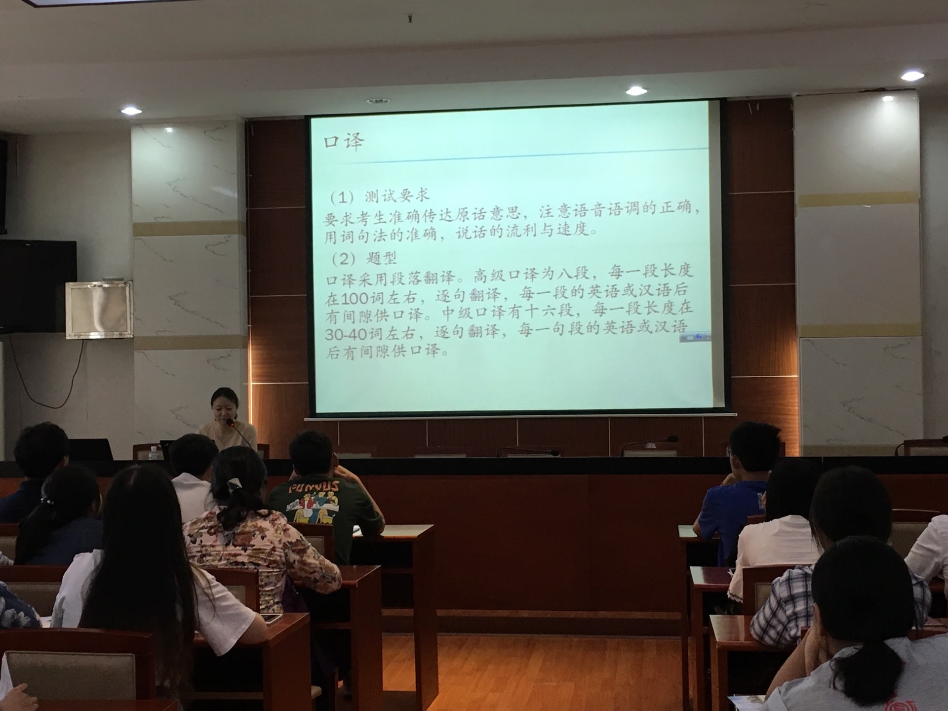 赵蓉博士以诙谐的语言和丰富生动的实例,论述了口译的原则、方法和技巧,并向在场的师生介绍了上海口译证书考试概况和题型。