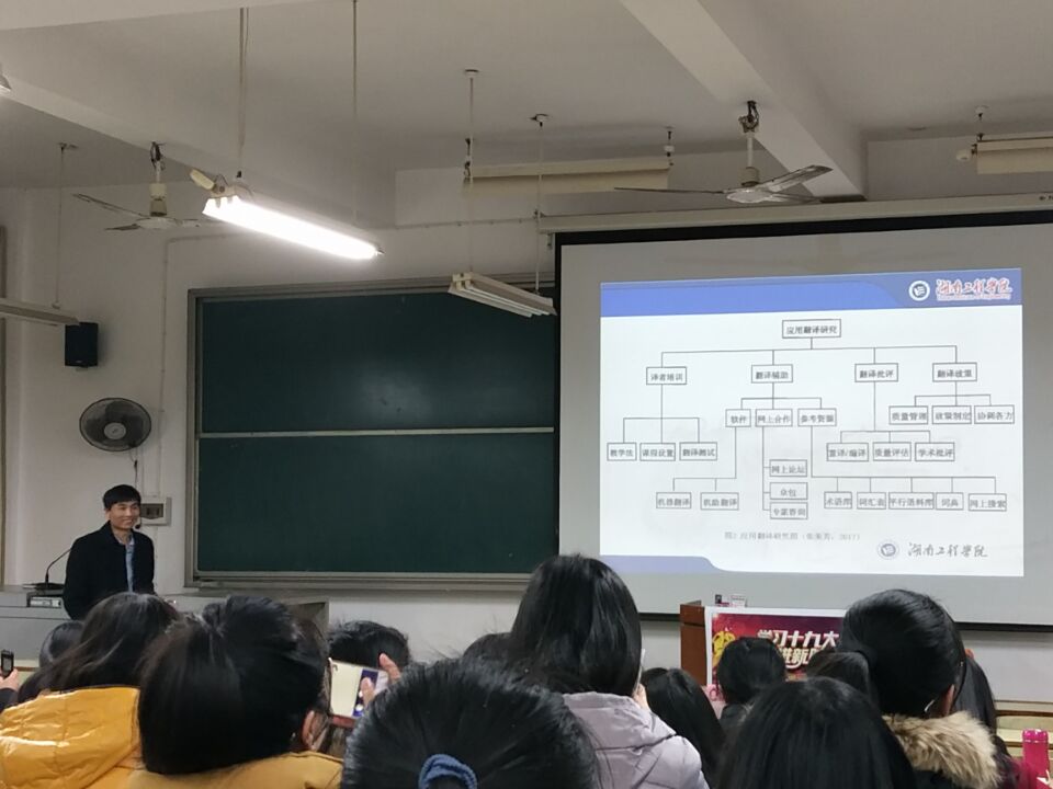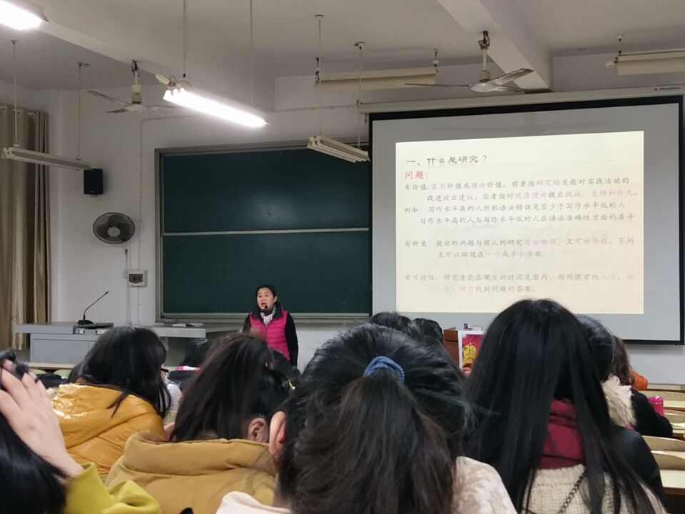 英语教研室邀请了罗胜杰副院长、王家义副院长、刘向红教授和彭禹博士分别就语言文化、翻译、英语教学和英美文学四个方向的毕业论文选题与研究方法进行了专题讲座。教研室朱洁、章明蕾、唐心洁、毛帅梅、刘肯红、周旭阳等老师与英语专业14级全体同学在D-502一起聆听。