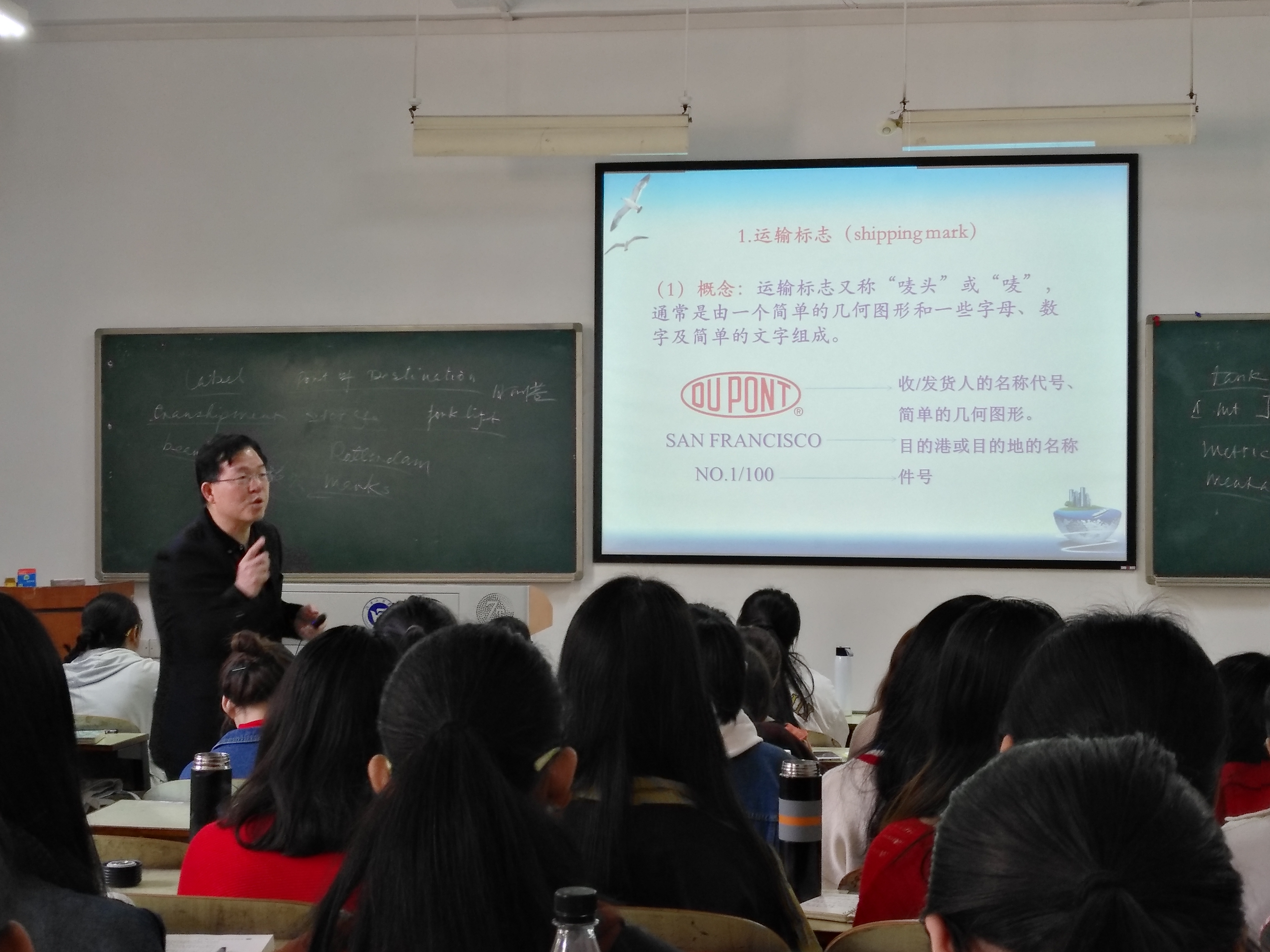 沈老师详细介绍了国际贸易中运输包装标志的各种分类,运用生动有趣的图片,条理清晰地讲解了运输标志及识别标志的概念、内容、作用和制作方法,并向学生们展示了不同的标志。然后,他依次介绍了指示性标志及警示性标志的定义和图示,最后进行内容小结,回顾了所有的概念、定义和要点。商务英语1602和1603班的学生学习兴趣浓厚,非常投入,与沈老师频繁互动,参与度非常高,学习效果良好。