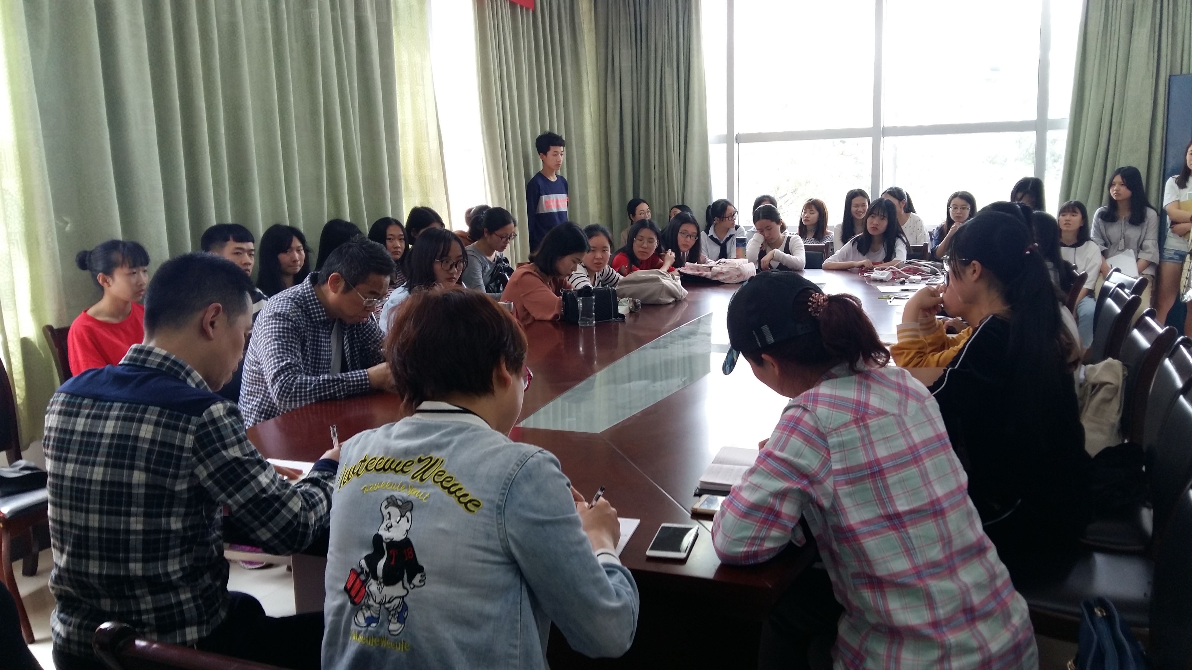 会议室召开了英语专业学生座谈会。院领导杨永和、罗胜杰,英语专业教研室主任朱洁、章明蕾以及教务干事沈仲平老师出席,