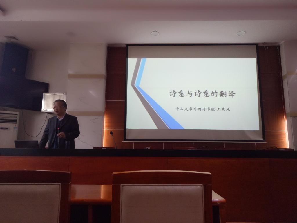 王东风教授治学严谨,幽默风趣,将高深的诗歌翻译用翻译实例阐述得深入浅出,深受与会师生欢迎,会场上不时爆发出热烈的掌声。提问环节气氛活跃,王教授与朱洁老师就翻译美学、与陈晓老师就翻译伦理和王荣富老师就“外译内”与“内译外”等问题展开深入交流与探讨,广大师生深感受益匪浅。