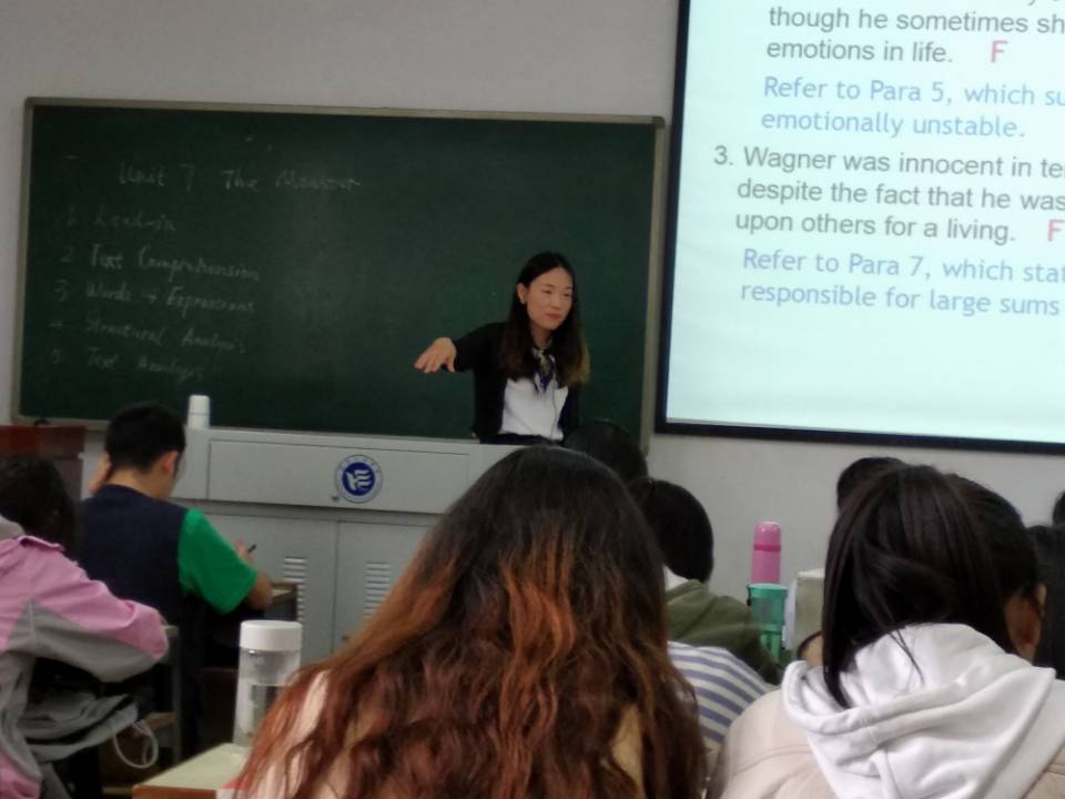 魏丽老师讲授的内容是《综合教程》(4)第七单元课文“The Monster”。首先以两位同学的陈述报告引入主题。第一位同学介绍了玛丽·雪莱笔下的“弗兰肯斯坦”,他描述了无名怪物的诞生和丑陋外貌,激发了其他学生了解的兴趣。第二位同学以《婚礼进行曲》引入对其创作者威廉·理查德·瓦格纳的介绍,并结合课文内容总结出瓦格纳的古怪个性和行为。展示过后,魏丽老师通过对学生陈述的详细点评,帮助学生加深对“monster”的理解和对课文背景知识的积累。接下来,她以一则听力练习进入对课文主要内容的分析,通过自主阅读和有效提问引导学生理解作者的写作思路和主要观点,并在此过程中融入词汇学习。整个过程学生积极参与,课堂气氛热烈,教学效果良好。