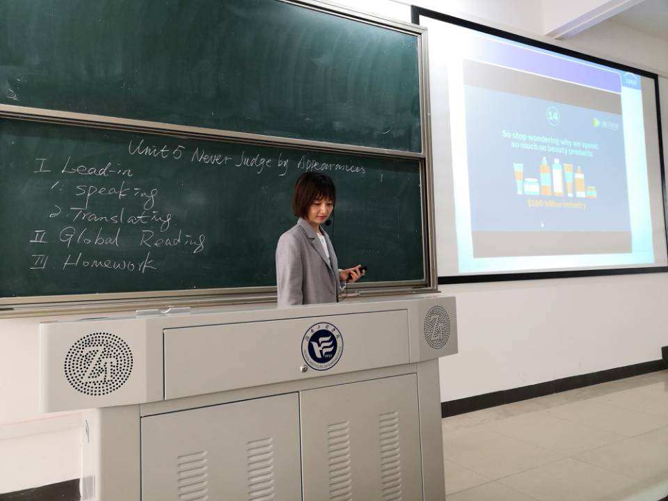 参照学校规定,每位参赛教师在15分钟内完成授课。第一位走上讲台的是陈细波老师。她使用的是《全新版大学英语》第四册教材,讲授的是第五单元——“不要以貌取人”。陈细波老师将5个教学步骤板书在黑板上,并配合ppt课件完成了课文的引入。她的图片展示环节让学生们明白“外表是具有欺骗性的”这个道理,她的词汇讲解过程详细生动,课堂测试环节引人入胜,讨论与最后的作业布置环节都让学生进行了批判性思考。第二位主讲人是何梦丽老师。她给大家带来的主题是“快乐”。她的讲述运用了丰富的语音素材并以写作技巧(否定与肯定)为线索,让学生参与课堂讨论,最终得出结论:有被否定的快乐和值得肯定的快乐两种。第三位主讲人是李漪琳老师。她的主题同样是“不要以貌取人”。她首先选用一个精美的视频让学生们明白人的长相、高度、对称性等外在因素正实实在在地影响着全世界人的生活。然后她结合生动的课堂问答与视频讨论的方法,以证伪的方式证明了“以貌取人”是会产生偏差和错误的。第四位主讲人是朱洁老师。她介绍了英语学习的一门新的功课——道德学习。她帮助学生了解了道德教育的本质和定义,并使用CBI教学模式带领学生在课内、课外、线上、线下使用各种英语素材寻找英语语境中与社会主义核心价值观对应的道德内容。四位教师的讲授内容丰富,表达流畅,层次清晰,内容使用得当,体现出了她们精心、专心和用心的准备过程。