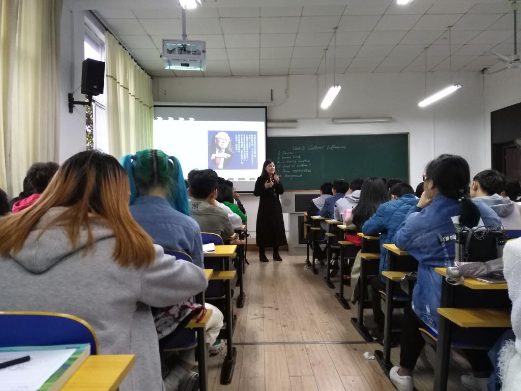 胡玢老师的公开课内容是《大学英语3》:Unit 3 Cultural Differences, 授课对象为应用化学专业1801和1802班的学生。她通过回顾旧知、小组合作的形式引入了这节课的主题。课堂中,胡玢老师以Cultural Differences为教学主题,组织同学们进行口语练习, 让学生们成为课堂的主体。接着通过听力练习进一步引入中外文化差异,然后,由余秋雨先生的一句话给整个主题下定义:文化是什么?最后通过欣赏古诗《石灰吟》来陶冶我们的爱国情操,体现了民族坚韧不拔的精神,引发学生们进行思考,我们能够为祖国做出什么贡献。胡玢老师的公开课内容环环相扣,内容安排重点突出,组织有序,课堂节奏适当。