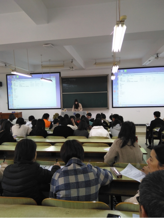 4月8号下午第5节,大英二教研室青年教师肖尘依萱在D502举行公开课,院领导杨永和、罗胜杰率二十余位教师前往观摩。
