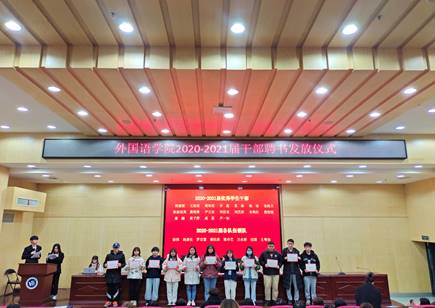 依次颁发了十佳榜样、特别贡献奖、优秀干部等奖项,并为学生干部颁发聘书。在同学们热烈的掌声中,杨永和院长宣读获奖名单并为他们颁发证书。十佳榜样代表宣传之星英语1901班李盈和特别贡献奖获得者英语1901班邓云锜同学发言。李盈介绍了自己工作经历,她表示:没有那么多天赋异禀,优秀的人总是翻山越岭。并且说到她一直坚持以工作需要为标准,事事以工作大局为重,正是这样负责的工作态度,才使得她如此之优秀。随后,邓云锜同学发表获奖感言并分享自己的在参加外研社写作比赛时的经验和心得。她说要写出一篇好的文章,要注重以下三个内容:一形式,二内容,三效率。通过她的分享,同学们感受到了所有成功的背后,都是用自己不断的付出换来的。