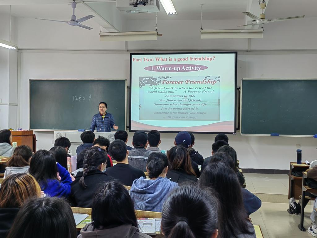 刘丽珍老师的公开课内容选自《大学进阶英语2》:Unit 3 Friendship, 授课对象为大数据2101和2102班的学生。刘老师通过社会主义核心价值观之“友善”导入主题;接着围绕“怎样描述你的朋友?”,“什么是好的友谊?”,“为什么友谊会终结?”,“怎样保持友谊?”等一系列问题进行听、说、读、写各项练习。刘老师准备充分,教学素材丰富,并能将信息化教学手段很好的融入课堂,如使用Welearn平台进行课前签到、作文批改等;课堂中,刘老师老师教态自然,能灵活使用各种教学方法,与学生互动多,并多处融入“友善”的思政元素。