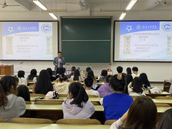 英语教研室特邀学院副院长吴斐博士开展教师资格证专题讲座,分享面试技巧,英语专业和商务英语专业100余名同学参加此次讲座。