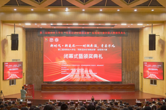 15日,大赛闭幕式暨颁奖典礼举行。中共湖南省委外事办副主任郭向丽,中共湖南省委教育工委委员余伟良,湖南国际传播中心主任刘骄,我校党委副书记、校长易兵,湖南第一师范学院副校长石元泉,高等教育出版社外语出版事业部主任肖琼,湖南省教学服务中心主任陈亮,湖南省外语课程思政联盟主任刘正光教授等嘉宾参加。闭幕式由校党委委员、副校长吴志军主持。