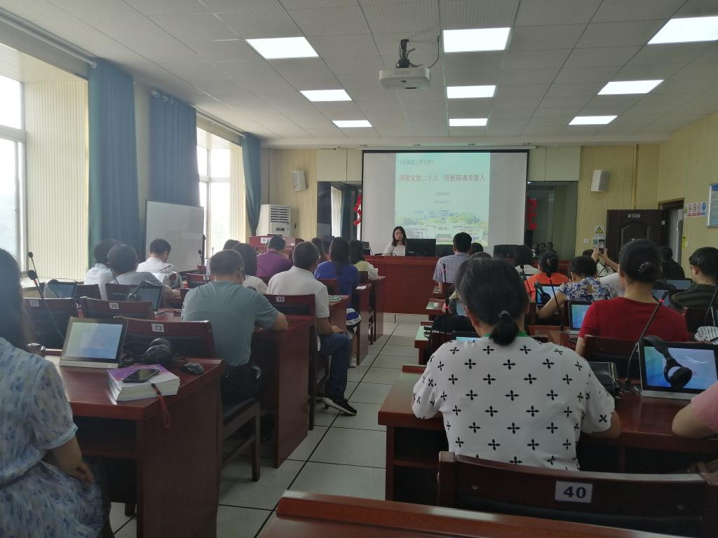 在F309以“喜迎党的二十大 培根铸魂育新人”为主题开展全体教职工理论学习,由党总支部书记陈亚琼主讲。