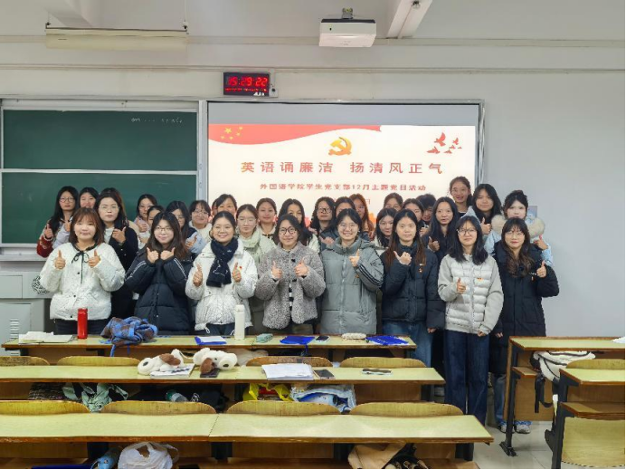 学生党支部在教学楼C栋202教室组织开展“英语诵廉洁 扬清风正气”十二月主题党日活动。支部全体党员齐聚一堂,以专业实践践行初心使命。