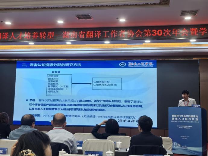湖南工商大学副校长张玲教授致辞,对湖南省译协兄弟单位莅临湖南工商大学表示热烈欢迎,对省译协和兄弟单位长期以来对湖南工商大学外语学科建设发展的支持表示感谢。中国译协常务副秘书长邢玉堂译审,湖南省翻译工作者协会会长曾艳钰也先后致辞。本次大会以“数智时代外语学科建设与翻译人才培养的转型”为主题,会议设8场专题报告,设翻译理论与实践、语言学与外语教学、文学与跨文化三类4组分组平行研讨,13组青年英才论坛。麻豆porn 王家义教授做了题为《 AI驱动下译者认知资源协同分配研究》的主题报告,内容包括为何要开展译者认知资源分配研究,采用了何种研究方法,并进行了案例分析,王家义教授的报告获得了与会者的广泛认可。