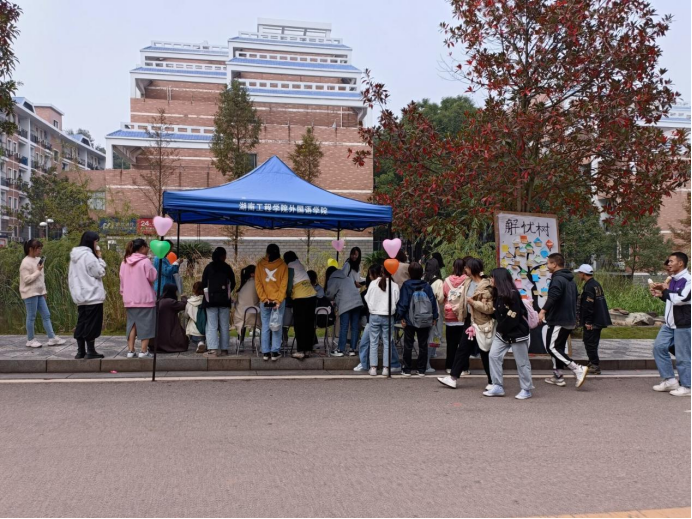 心理部准备的小奖品。而回答过的贴纸则会与问题一起贴在海报上。许多同学都被海报吸引而驻足,黑色的解忧树上贴满了彩色的贴纸,每一张贴纸上的问题和回答都是两个灵魂间的碰撞,他(她)们互相传递喜悦,分享烦恼,在问与答中治愈彼此。